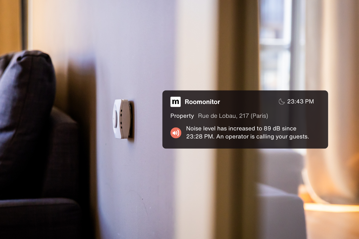 Les niveaux de bruit sont mesurés pour protéger la vie privée des invités. Le système analyse intelligemment les modèles de bruit et vous avertit lorsque les seuils prédéfinis sont dépassés.